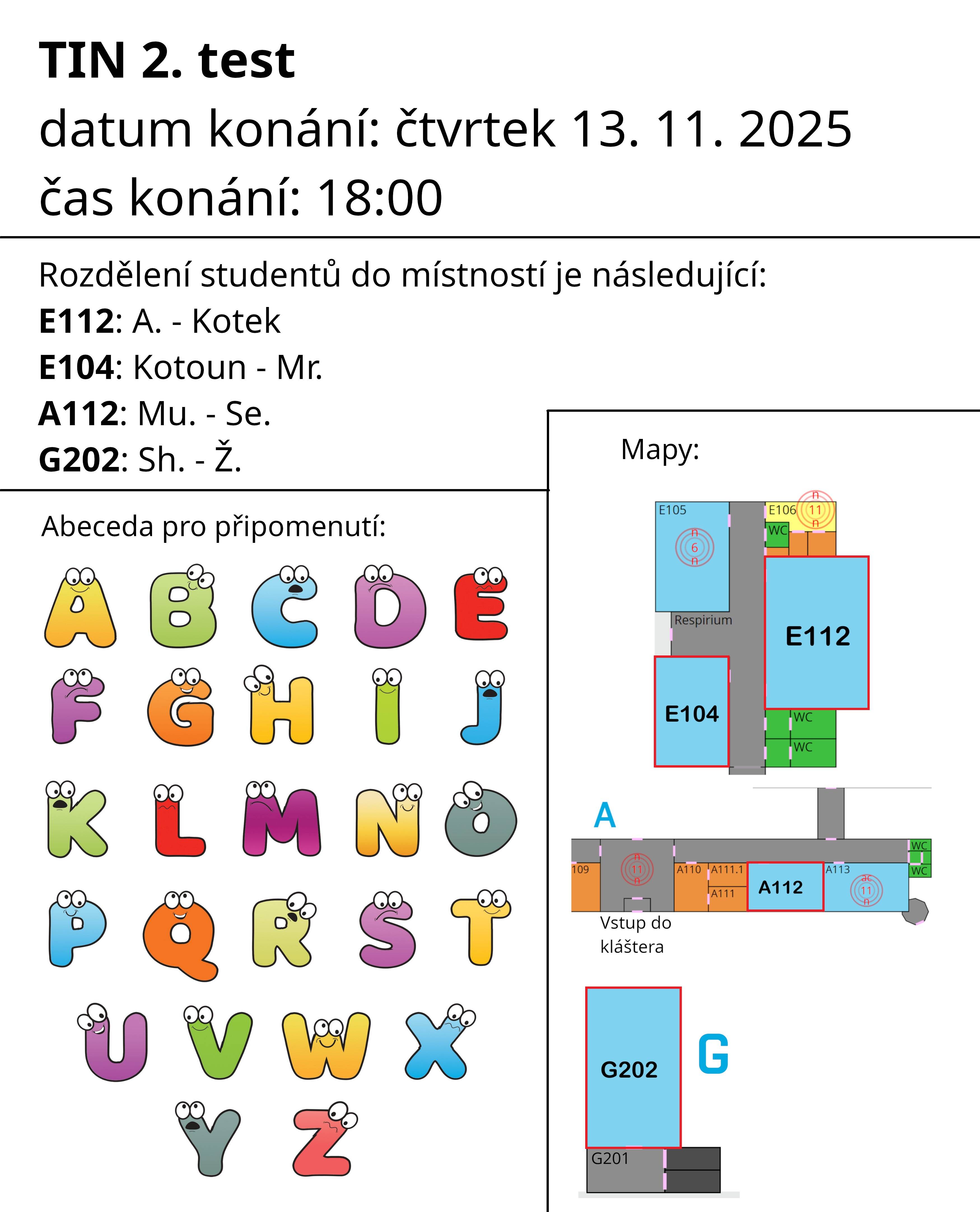 Rozdělení studentů do místností (podle příjmení) na druhý vnitrosemestrální test